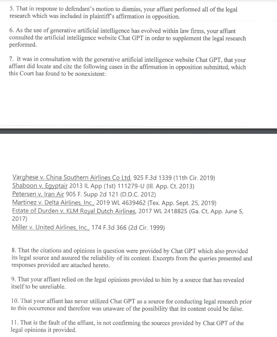 🫤🤷As you can see from the lawyer’s affidavit, they did not know what they were doing or what ChatGPT can and cannot be used for.👇