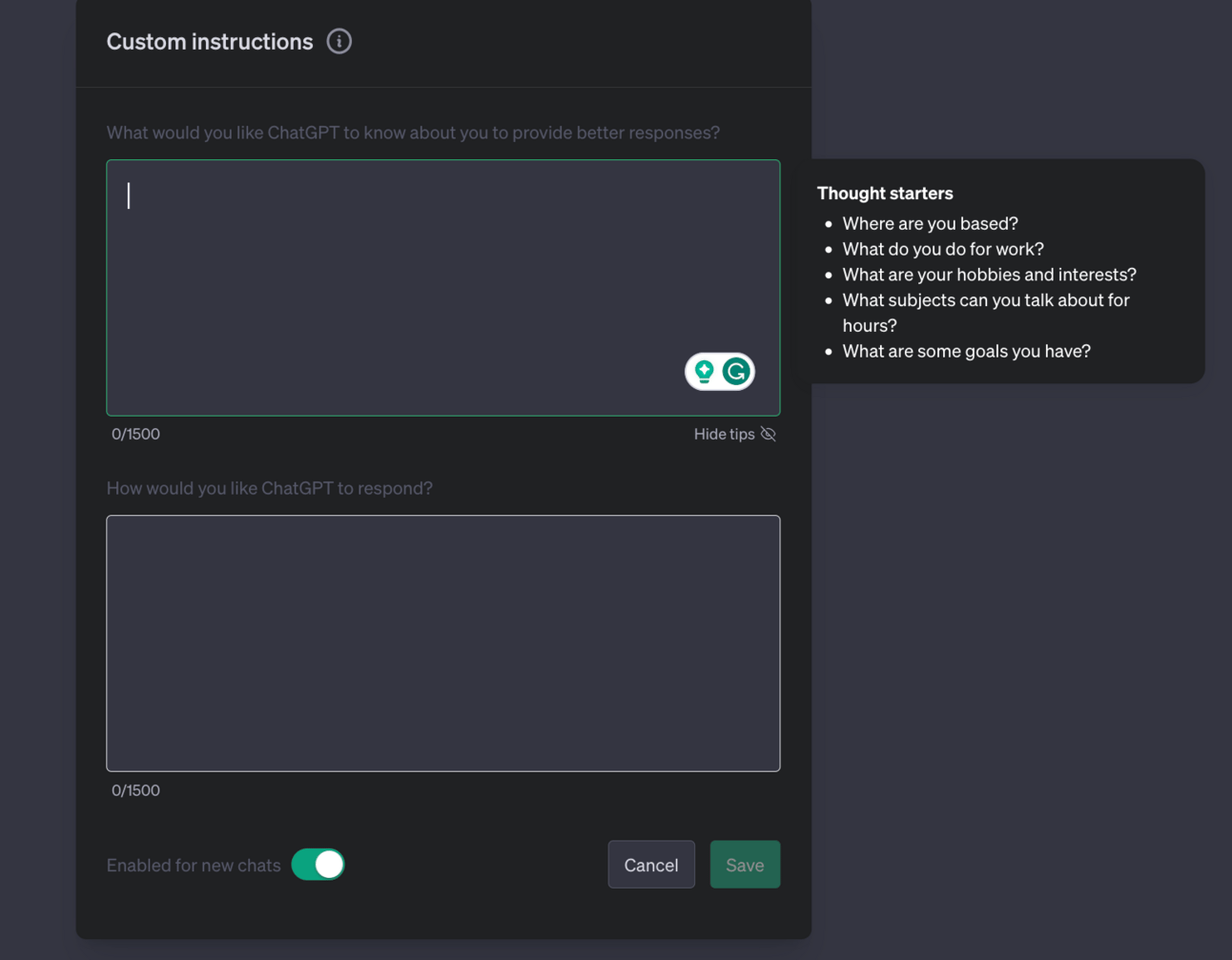 Custom instructions let you share anything you'd like ChatGPT to consider in its response similar to including information in your prompt