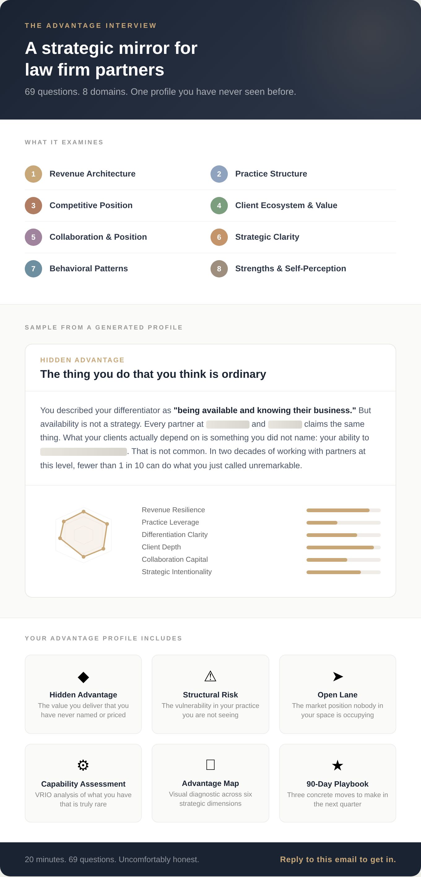 You answer 69 questions across 8 domains: how your practice makes money, how it is structured, what differentiates you, how your clients actually see you, how you collaborate internally, where your strategy is (or is not), how you behave with clients, and what your natural strengths are.